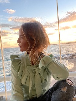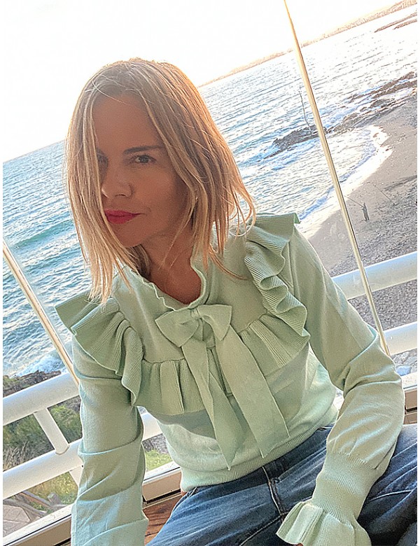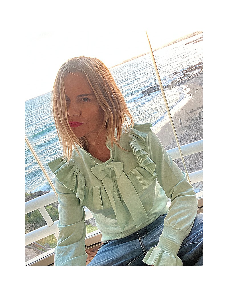 Jersey de tacto amoroso, cuello con lazada, puño en flor ideal para tus OUTFIT de oficina o sofisticados